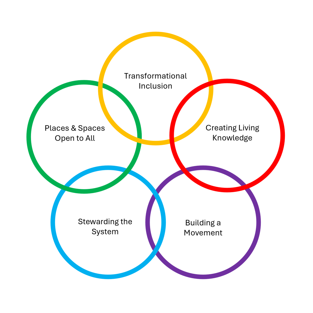 The key outcome of the Engaged Futures Group Workshop 2 in July 2025 was the identification of five 'Domains of Action' — clusters of actors and initiatives that are already contributing to systemic change in higher education. These domains emerged through a participatory clustering process, informed by the Three Horizons framework and a refined shortlist of H2+ actors (disruptive and innovative organisations working toward transformation).